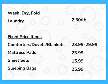 Wash, Dry, Fold, laundry $2.30/lb. Fixed price items: Comforters/Duvets/Blankets $23.99 - $29.99, Mattress Pads $23.00, Sheet Sets $15.99, Sleeping Bags $25.99